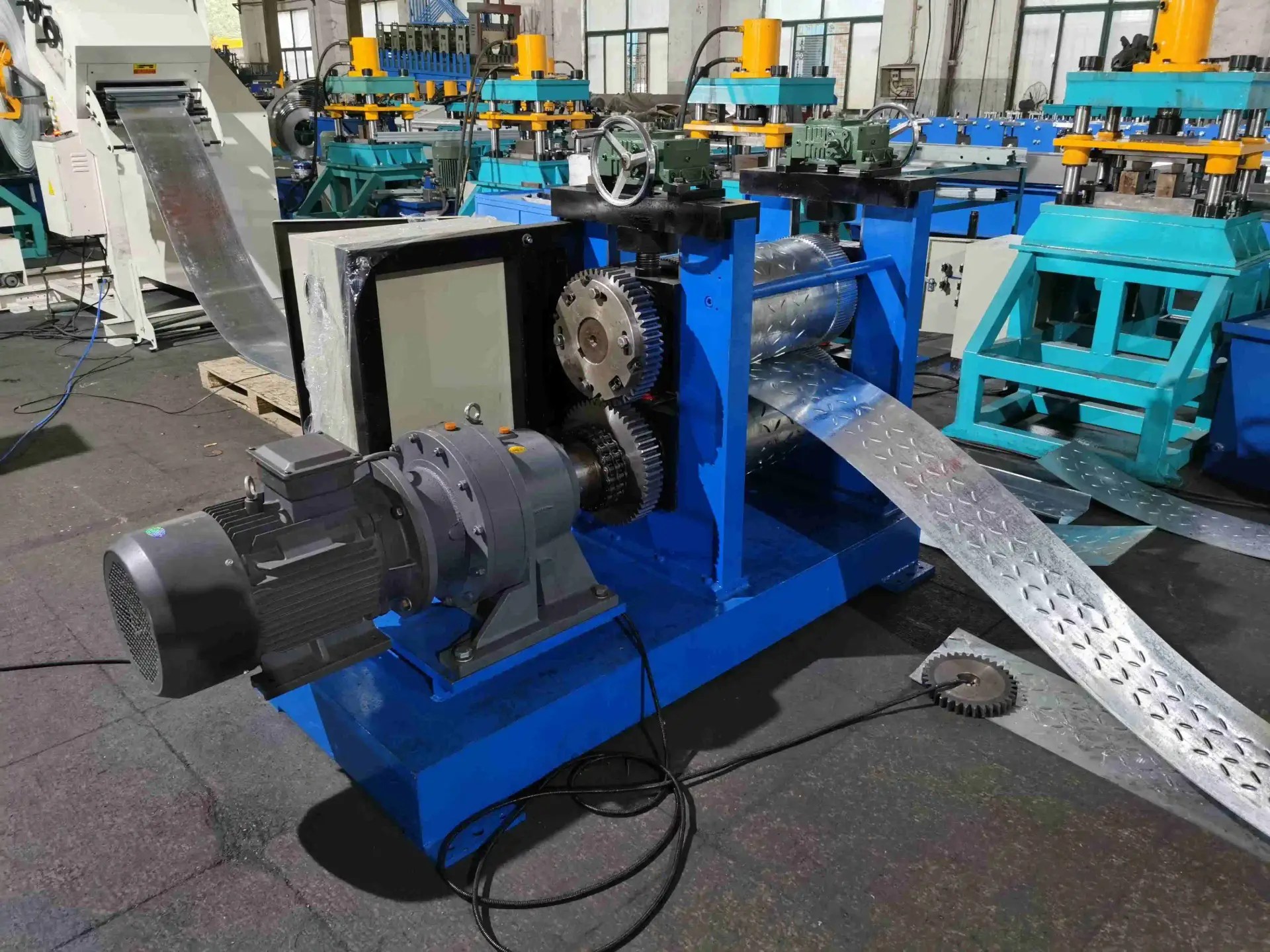 Os relevos ou furos antiderrapantes são criados antes do processo de conformação por rolos. A linha inclui uma prensa hidráulica ou uma prensa mecânica.